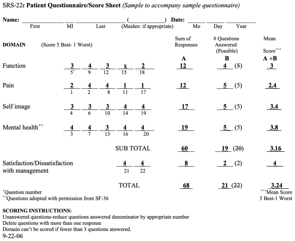 Asher, Marc, et al. “The reliability and concurrent validity of the scoliosis research society-22 patient questionnaire for idiopathic scoliosis.” Spine 28.1 (2003): 63-69.